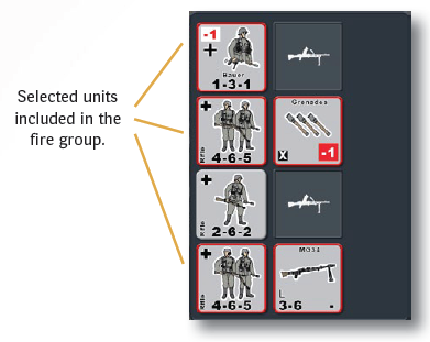 Infantry units occupying the same hex may form a fire group, combining their APFP ratings to fire at the same target, or they may fire separately (or in smaller fire groups) at different targets. Infantry units in the same hex may not fire separately at the same target; if the units are attacking the same target, during the same turn, they must form a single fire group and combine their APFP ratings. A leader may use his Leadership Modifier to modify a fire group’s attack, in addition to adding his APFP rating. Fire groups may be formed by selecting multiple units in the Unit Selection Popup in the Battle Interface.