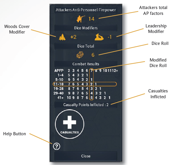 The game assists the player by changing the mouse pointer to a cross-hair when it is over hexes that contain valid targets for an AP attack. The attack is resolved automatically by the game by “rolling” two dice. Cover and leadership modifiers are applied to the roll, and the total is then used to find the combat result on the Anti-Personnel Combat Table. The result is found by cross-referencing the final, modified dice roll and the total APFP rating of the attacking fire group. AP fire attacks are applied to a hex, and therefore their effects will affect all enemy units in the hex. For example, if the enemy hex contains a squad and a gun, both may be affected by the attack
