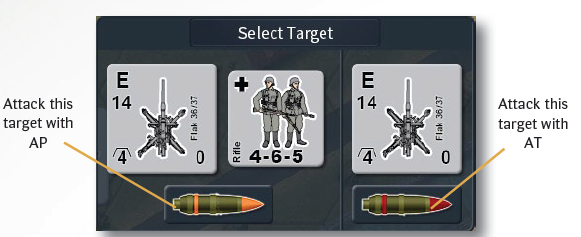 Some weapons, such as AFV main guns, guns, and squad AT support weapons (bazooka, Panzerschreck) have both an AP and AT capability. If the player targets a hex with multiple targets that can be attacked by a weapon, they will be asked to select a particular target.